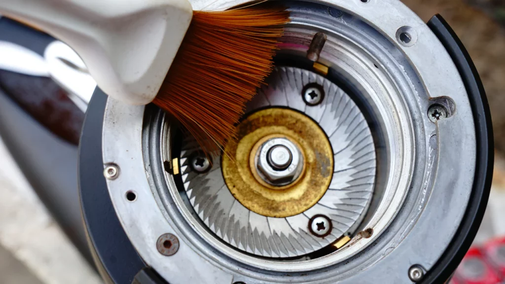 نظافت تیغهها: توصیه میشود به ازای هر ۴ کیلوگرم قهوه (یا ۲ کیلوگرم برای روستهای تیره و چرب)، تیغهها را تمیز کنید.